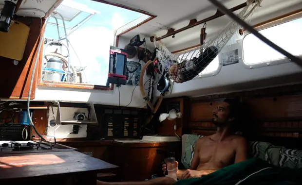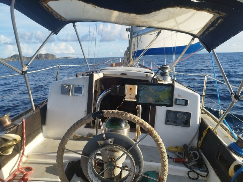 Le jour où je décidai de faire ma première navigation en solitaire fut chargé en adrénaline. Je ne connaissais pas le bateau et il me fallut donc me concentrer pour ne pas louper une étape. OK, tout d’abord ouvrir la valve de carburant, c’est fait, ensuite tourner l’interrupteur sur batterie 2, batterie de démarrage, c’est fait, puis glisser le levier de vitesse. « Glisser le levier de vitesse !? » … Merde, qu’est-ce que j’avais voulu dire par là. J’ai écrit ça mais je ne m’en souviens pas. Après m’être cassé la tête un moment sur la question, cela devient évident. OK, ce truc glisse là et maintenant, je peux mettre le moteur en marche avant dès que je suis prêt. Allez, maintenant on remonte l’ancre. A la main, ça prend toujours un peu de temps, mais avec de la patience c’est possible de la remonter sans trop gaspiller de force. C’est bon, l’ancre est remontée à bord. Maintenant, on court dans le cockpit mettre la marche avant, ne pas taper dans les autres bateaux, OK c’est facile il y a de la place pour manœuvrer, je suis en train de sortir de la baie au moteur, cool ! Maintenant, on met le bateau face au vent et on hisse la grande voile, allez ! Meeerde, c’est bloqué ! Qu’est-ce qu’il se passe. Oh le coup classique, les lignes de riz, je les débloque et hop, la grande voile est hissée ! J’éteins le moteur. Aaaaah le silence. Enfin. Et la brise qui nous pousse délicatement vers le large. Je déroule le génois. Règle les voiles. Parfait, on navigue. Pfff, c’était un poil intense pour les nerfs mais tout va bien.