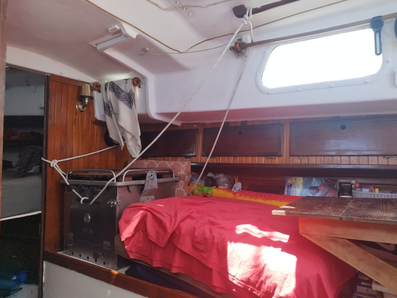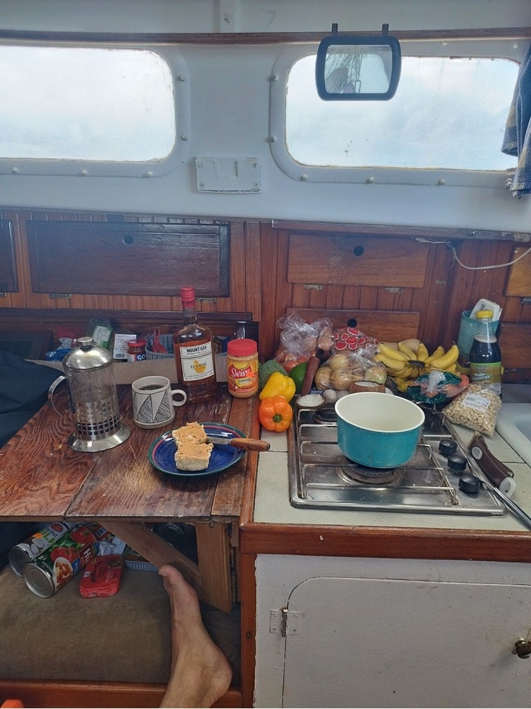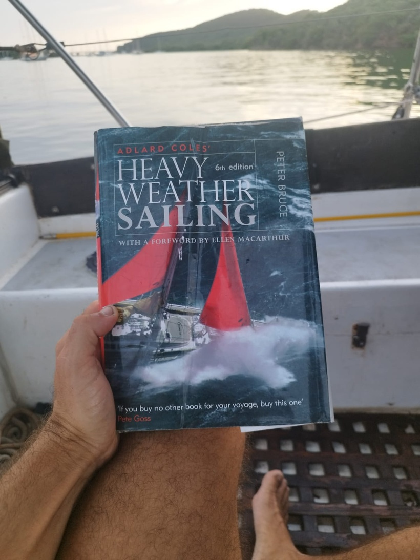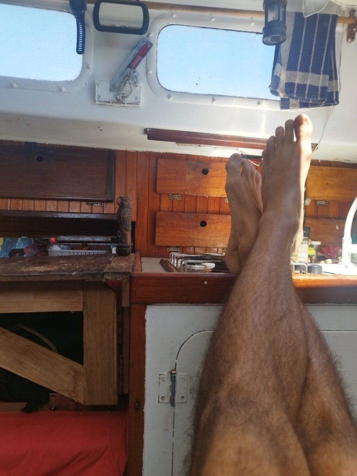 J’aimerais bien un bon vieux sextant, de vrais cartes marines en papier, un spinnaker, une grande voile en bon état avec trois bandes de riz, deux self-tailing winchs pour la voile d’avant, un régulateur d’allure, etc. Mais bon, je navigue et j’aime ce bateau. Je me sens déjà tellement chez moi dessus.