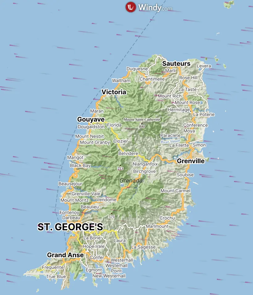 Un coup d’œil à la carte des courants sur Windy me confirme qu’il semble y avoir deux approches à ce problème. Soit on navigue en restant près de la côte comme conseillé par Cornell, ou alors on prend le large pour éviter la partie ou le courant est le plus fort et qui semble monter jusqu’à 2-2.5 nœuds. Je vais faire plus de recherches. Mais d’abord, il me faut aller à la Grenade et rebaptiser Limonada avec son nouveau nom de Viking : Valhalla !