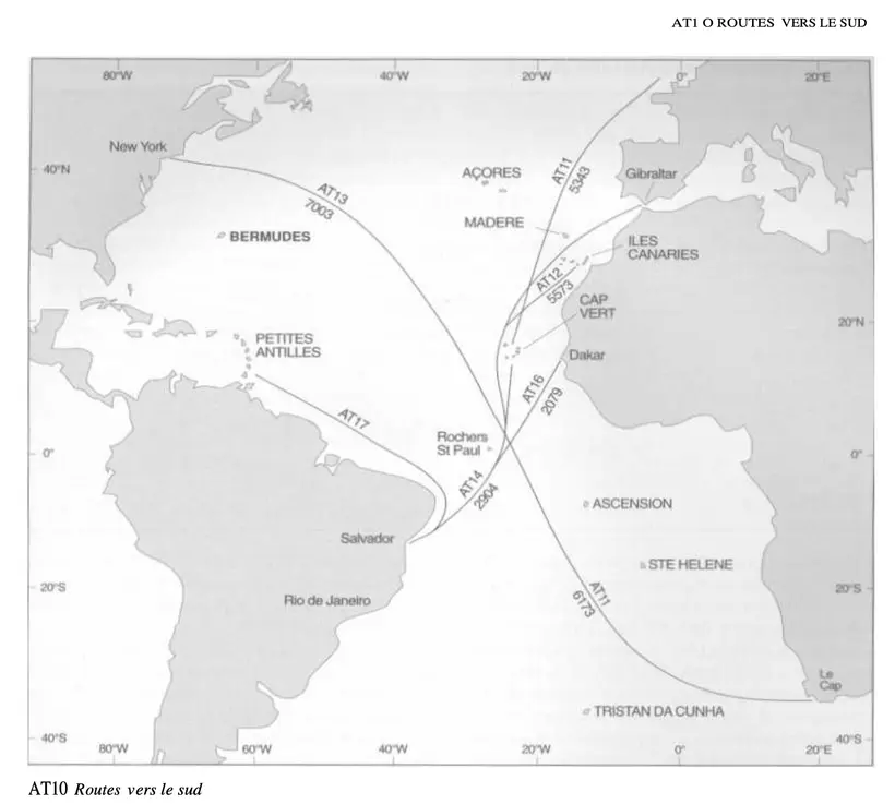 « Le fort courant de la Guyane qui porte au nord- ouest dissuade la plupart des gens d'entreprendre cette traversée directe, et ceux qui l'ont tenté dans le passé ont préféré prendre une route au large. Cependant, en restant près de la côte, il est possible d'éviter la majeure partie du courant. En restant dans des eaux relativement peu profondes, on évite la majeure partie ou même la totalité de ce fort courant de Guyane qui porte au nord-ouest. Le meilleur endroit pour commencer ce voyage est Trinidad d'où l'on devra suivre la côte de l' Amérique du sud en restant à proximité ou même à l'intérieur de la ligne de sonde des 20 m. »