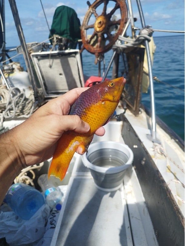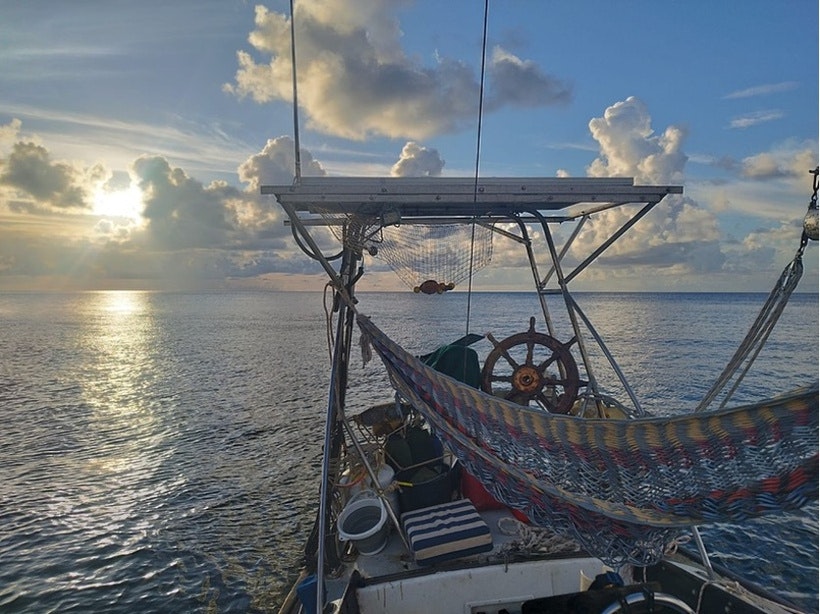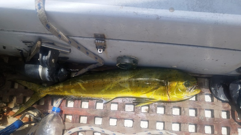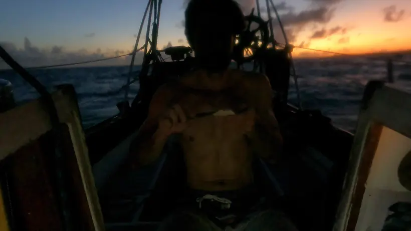 Je suis seul en mer. Pour la première fois dans une navigation en solitaire, je ne vois pas de terre ni derrière moi, ni devant moi, ou même tout autour de moi. Seule l’immensité du grand bleu enveloppant Valhalla. J’ai enclenché le suivi sur mon Garmin inReach ce qui me permet de partager mon trajet avec un point de suivi toutes les quatre heures. Je peux envoyer un message via satellite sur un point précis de mon trajet informant ma famille et mes amis de ce qu’il se passe, comment je me sens ou simplement leur faire savoir que tout va bien. Je déploie la ligne de pêche avec mon nouveau leurre mais après plusieurs heures rien n’a mordu. Je décide donc de la retirer juste pour voir. Et, surprise, alors que je tire dessus, ça mord ! Ça pèse lourd alors je suis tout excité et tente tant bien que mal de remonter méthodiquement la ligne, pas trop vite, pas trop lentement, j’essaye de fatiguer un peu ce gros poisson avant de le remonter dans le cockpit ou il pourrait bien sauter à l’eau au moment fatidique dans une tentative de survie désespérée. Quand j’arrive finalement à le sortir de l’eau, oh wouah ! C’est un grand Mahi-Mahi tout doré ! Vraiment un beau spécimen ! J’essaye de me souvenir comment Tom m’a appris à préparer le poisson en commençant par le vider bien sûr, ensuite je l’entaille pour lui retirer la peau et finalement lui lever les filets. Je découpe la chair en de jolis morceaux que je lance dans du lait de coco avec du curry et des épices. Un repas délicieux et réconfortant.