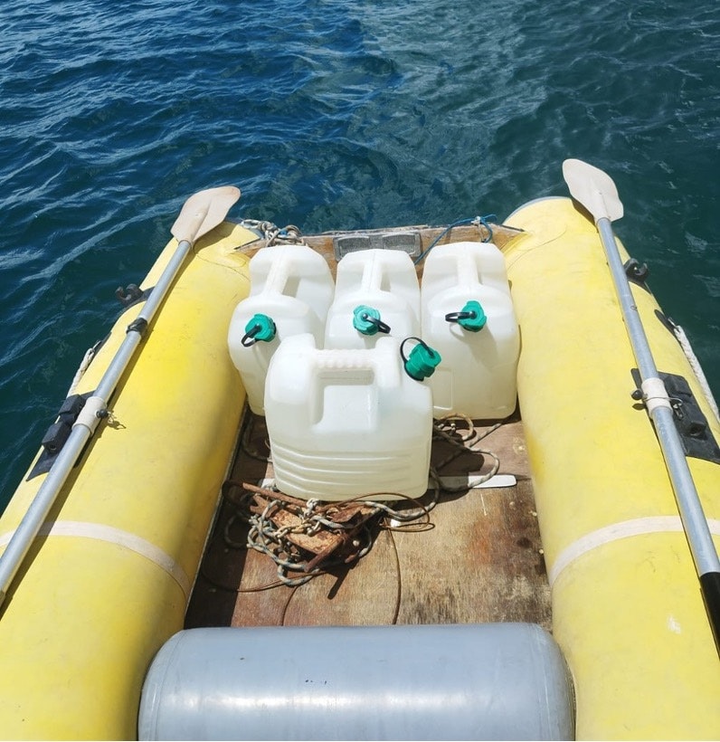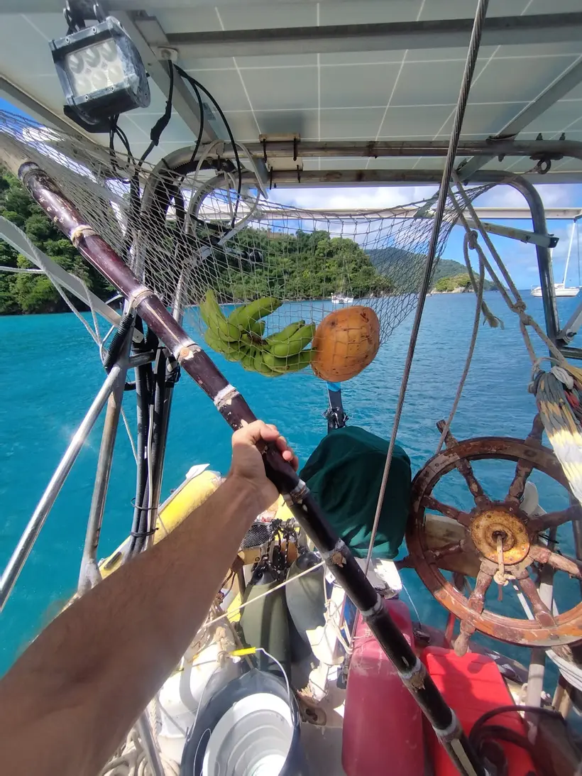J’ai rapidement fait connaissance avec mes voisins d’ancre : Timo & Livi à bord d’Ente et Jay & Chiara à bord d’Amanzi. Deux couples dans la même tranche d’âge. Un des aspects principal qui m’inquiétait avant de me lancer dans la navigation en solitaire était l’isolement. Je fus donc heureux de rencontrer et connecter avec d’autres marins, qui plus est de mon âge. J’ai trouvé une fouenne sur Valhalla, sorte de long trident fait pour harponner les poissons sous l’eau. La pêche au harpon est une chose que j’ai toujours voulu essayer ! Nous allâmes pêcher un des jours suivants avec Timo, Jay et Chiara et j’étais enthousiaste de m’essayer à la chasse au poisson. Ceux-ci s’enfuirent très rapidement face à la menace que représentait mon long trident jaune, cela s’annonça donc plus difficile que prévu mais j’étais tout de même très heureux de m’y essayer. Jay me donna un maquereau que je préparai immédiatement avec du citron et des épices et le fit frire à la poêle pour mon souper. Alors que j’écris ces lignes, les deux vaisseaux, Ente et Amanzi, s’en sont allés avec leurs équipages respectifs, ce n’est donc plus que Valhalla et moi maintenant, et bien sûr les autres navires inconnus. À terre, il reste Huub et Ben.