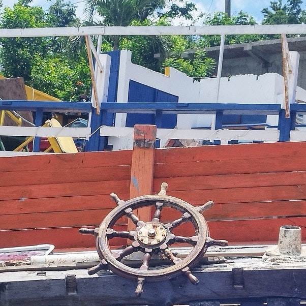 Vous n’êtes probablement pas au courant mais Carriacou a été frappé par l’ouragan Beryl il y a quelque mois et la plupart des bateaux ont été détruits, certains abandonné, d’autres démâtés, attendant piteusement le retour de leur propriétaire. Celui-là, par contre, était échoué sur la plage, couché sur le côté et salement abîmé.